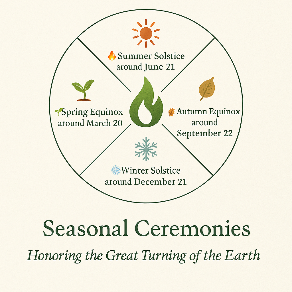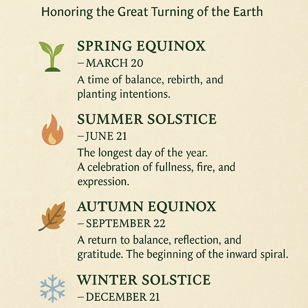 The Green Flame follows the rhythm of the Earth, not the calendar. The solstices and equinoxes mark sacred thresholds—moments of great balance, transition, and power.